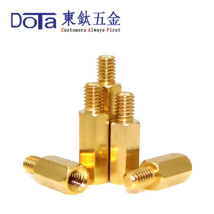 銅六角螺柱又叫陰陽螺柱、又稱陰陽螺釘、銅柱等等。是一端為內螺紋而另一端為外螺紋的一種螺絲,多采用金屬銅為直接原料,廣義的陰陽螺釘也包含兩端都是內螺紋的螺絲。其外觀大多呈六角形,起緊固及隔離作用,因其一般都采用六角銅棒為原料生產而成。主要應用于電腦、線路板等行業(yè),當一端擰入被鎖物件后,六角柱露于外面,可將其它物件固定或隔離。陰陽螺釘裝配在電腦主機上,外螺紋連接主機里面的主板,內螺紋把主板和鈑金外殼隔離開來 ,把需要連接的端子線用一個螺絲從鈑金外殼和陰陽銅柱的內螺紋相連。
