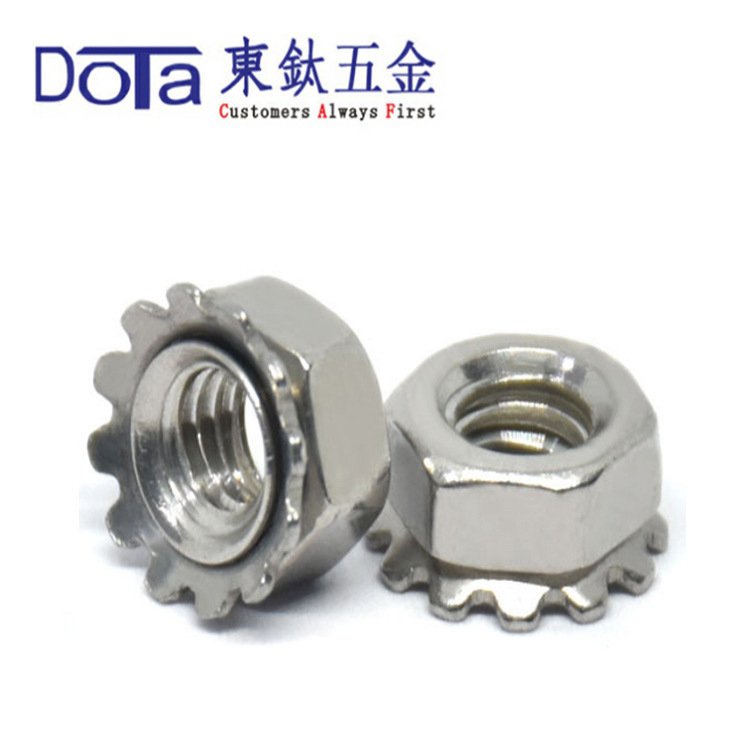 K型螺母又稱K帽、花齒螺母,是在六角螺母的一端利用沖壓工藝壓入一個可活動的花齒片,在鎖緊的過程中利用花齒的彈性和花齒的防滑齒達到鎖緊和防松的目的。因為使用方便且效果明顯,被廣泛用于電機、機械裝配行業(yè)。